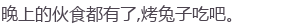 烤着火,跟着一伙子说说笑笑的。由开始的拘谨,到最后什么都敢往出倒,也不过是吃一只兔子的时间而已。